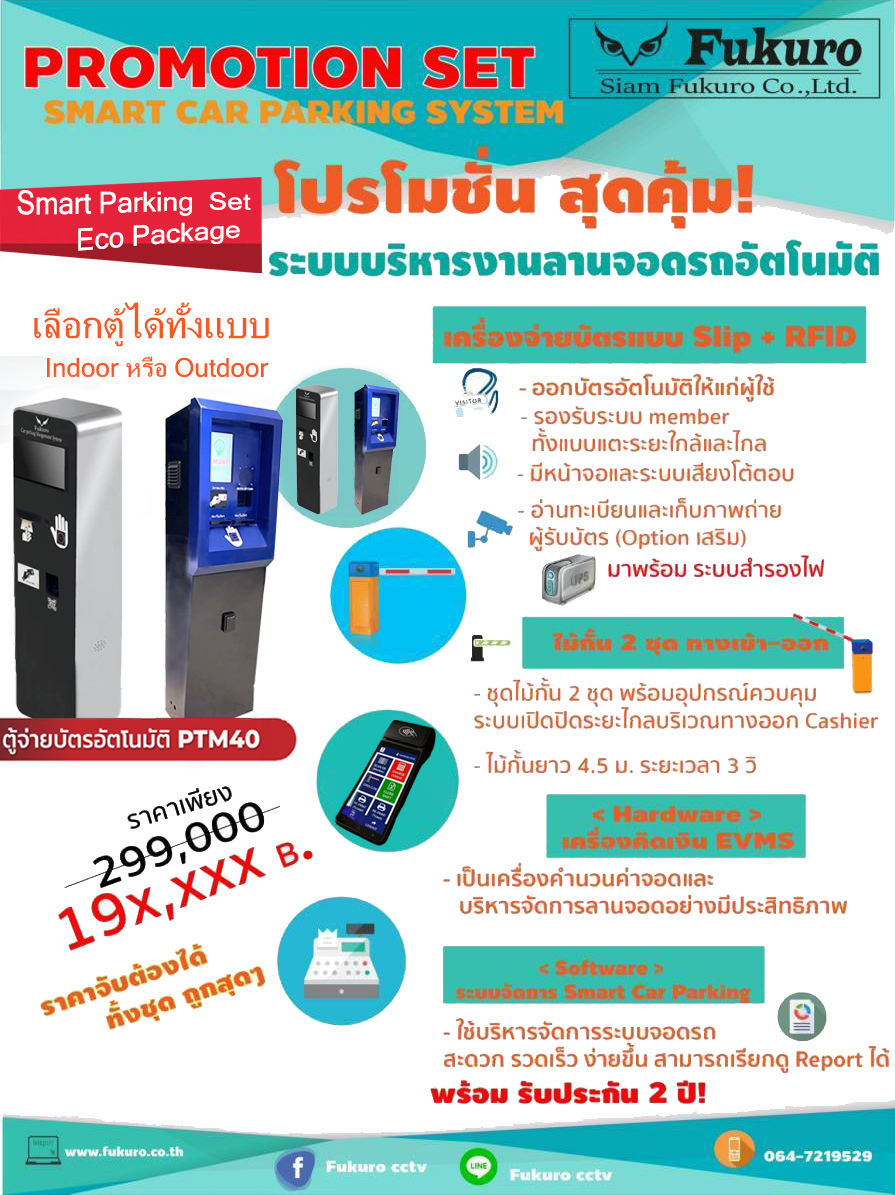 โปรโมชั่น สุดคุ้ม !! ตู้จ่ายบัตรอัตโนมัติ PTM40 มีให้เลือก 2 แบบ คือ INDOOR และ OUTDOOR เป็นเครื่องจ่ายบัตรแบบ Slip + RFID ออกบัตรอัตโนมัติให้แก่ผู้ใช้ รองรับระบบ member ทั้งแบบแตะระยะใกล้และไกล มีหน้าจอและระบบเสียงโต้ตอบ อ่านทะเบียนและเก็บภาพถ่าย ผู้รับบัตร (Option เสริม) มาพร้อม ระบบสํารองไฟ มีไม้กั้น 2 ชุด ทางเข้า-ออก ชุดไม้กั้น 2 ชุด พร้อมอุปกรณ์ควบคุม ระบบเปิดปิดระยะไกลบริเวณทางออก Cashier ไม้กั้นยาว 4.5 ม. ระยะเวลา 3 วิ เครื่องคิดเงิน EVMS เป็นเครื่องคํานวณค่าจอดและบริหารจัดการลานจอดอย่างมีประสิทธิภาพ ระบบจัดการ Smart Car Parking ใช้บริหารจัดการระบบจอดรถสะดวก รวดเร็ว ง่ายขึ้น สามารถเรียกดู Report ได้ พร้อม รับประกัน 2 ปี! ราคาจับต้องได้ ทั้งชุด จากราคา 299,000 บาท เหลือเพียง 19X,XXX บาท
